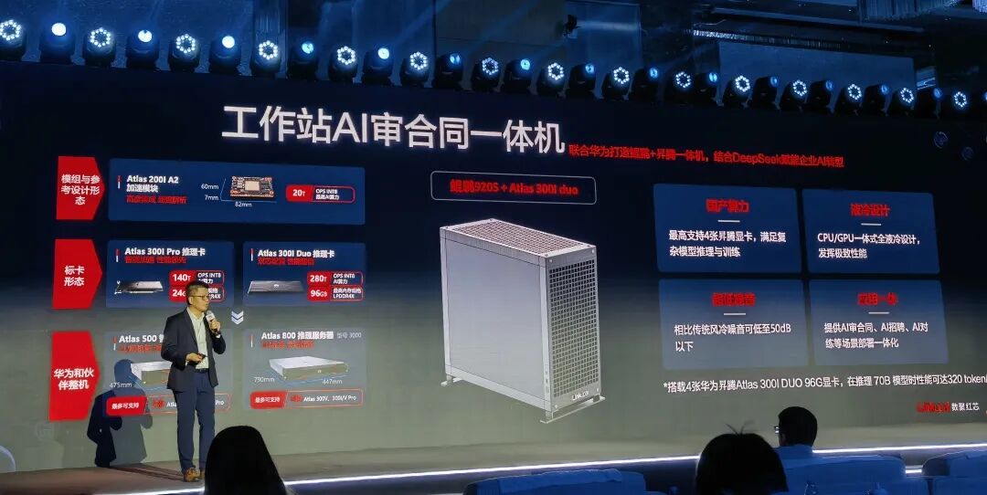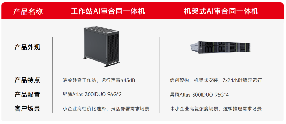 在此次联合发布环节,数聚红芯基于昇腾Atlas 300IDUO系列高性能算力模块,推出适配不同场景的AI审合同一体机产品组合。