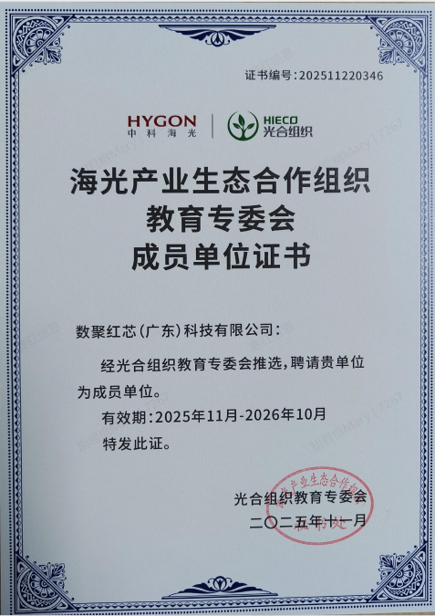 会上,数聚红芯作为海光产业生态合作组织成员,获颁“光合组织教育专委会成员单位”证书。数聚红芯未来会携手生态伙伴共同推动教育数字化转型升级,为构建安全、创新的智慧教育体系贡献力量。